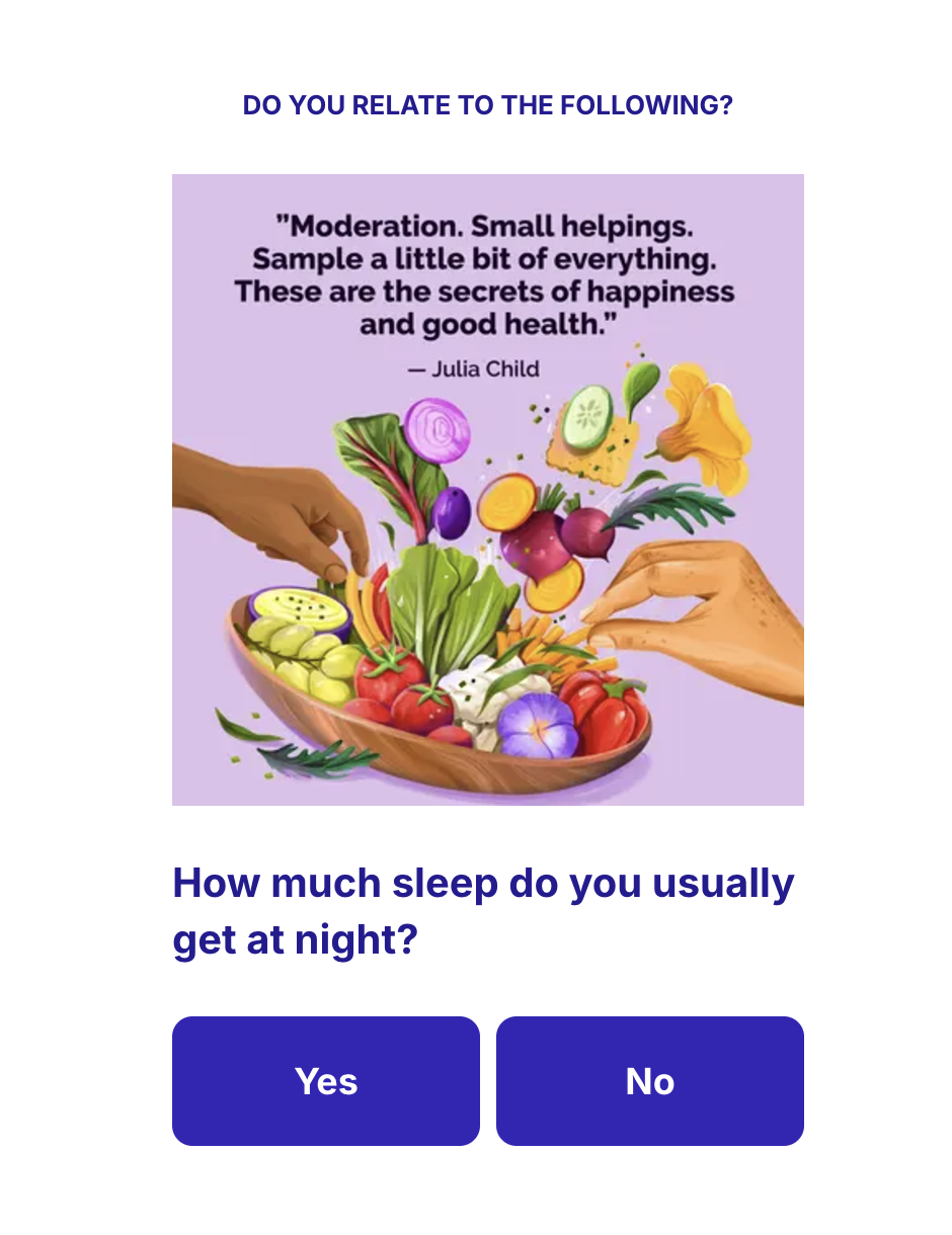 The yesNoQuestion is a special question template that represents a question with binary CTA. It includes intro text, image and title, a template should include at least one of the previous properties.